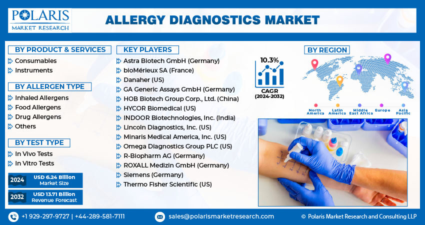 Global Allergy Diagnostics Market size and share is currently valued at USD 6.24 billion in 2024 and is anticipated to generate an estimated revenue of USD 13.71 billion by 2032, according to the latest study by Polaris Market Research. Besides, the report notes that the market exhibits a robust 10.3% Compound Annual Growth Rate (CAGR) over the forecasted timeframe, 2024 – 2032