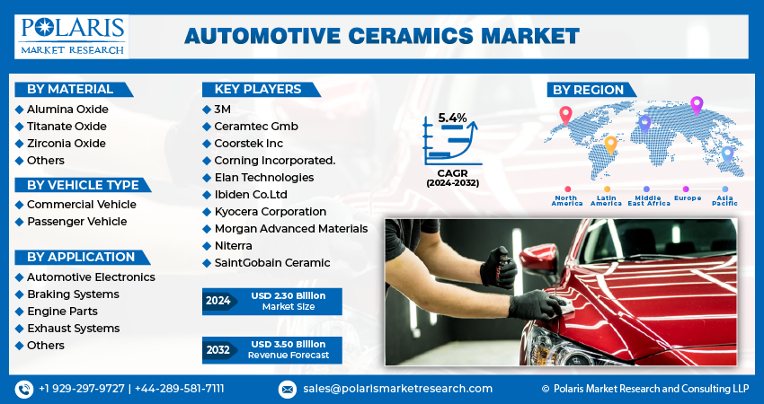 Global Automotive Ceramics Market size and share is currently valued at USD 2.19 billion in 2023 and is anticipated to generate an estimated revenue of USD 3.50 billion by 2032 according to the latest study by Polaris Market Research. Besides, the report notes that the market exhibits a robust 5.4% Compound Annual Growth Rate (CAGR) over the forecasted timeframe, 2024 – 2032