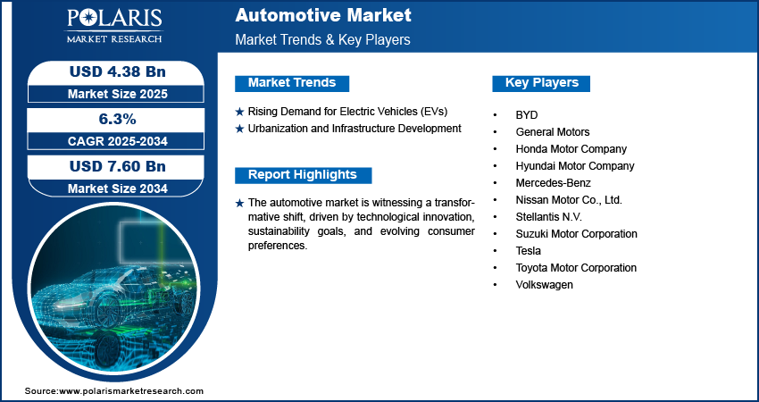 Global Automotive Market size and share is currently valued at USD 4.14 billion in 2024 and is anticipated to generate an estimated revenue of USD 7.60 billion by 2034, according to the latest study by Polaris Market Research. Besides, the report notes that the market exhibits a robust 6.3% Compound Annual Growth Rate (CAGR) over the forecasted timeframe, 2025 – 2034