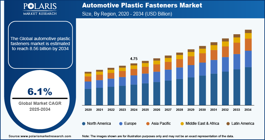 Global Automotive Plastic Fasteners Market size and share is currently valued at USD 4.75 billion in 2024 and is anticipated to generate an estimated revenue of USD 8.56 billion by 2034, according to the latest study by Polaris Market Research. Besides, the report notes that the market exhibits a robust 6.1% Compound Annual Growth Rate (CAGR) over the forecasted timeframe, 2025 – 2034
