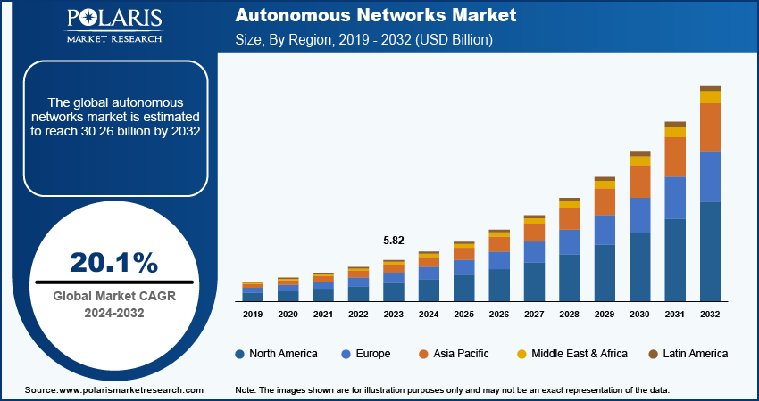 Global Autonomous Networks Market size and share is currently valued at USD 6.99 billion in 2024 and is anticipated to generate an estimated revenue of USD 30.26 billion by 2032, according to the latest study by Polaris Market Research. Besides, the report notes that the market exhibits a robust 20.1% Compound Annual Growth Rate (CAGR) over the forecasted timeframe, 2024 – 2032