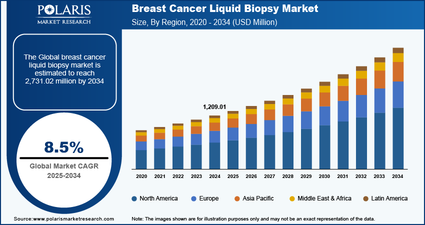 Global Breast Cancer Liquid Biopsy Market size and share is currently valued at USD 1,209.01 million in 2024 and is anticipated to generate an estimated revenue of USD 2,731.02 million by 2034, according to the latest study by Polaris Market Research. Besides, the report notes that the market exhibits a robust 8.5% Compound Annual Growth Rate (CAGR) over the forecasted timeframe, 2025 – 2034