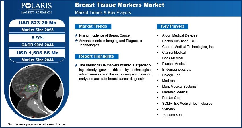 Global Breast tissue markers market size and share is currently valued at USD 770.98 million in 2024 and is anticipated to generate an estimated revenue of USD 1,505.66 million, according to the latest study by Polaris Market Research. Besides, the report notes that the market exhibits a robust 6.9% Compound Annual Growth Rate (CAGR) over the forecasted timeframe, 2025 – 2034