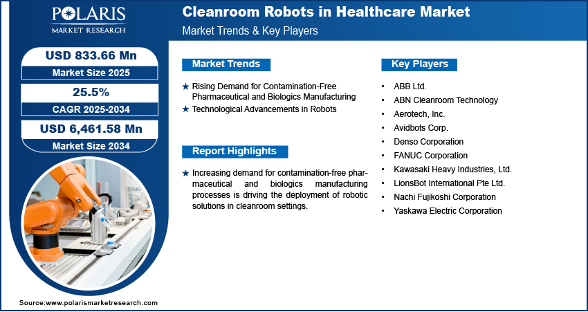 Global Cleanroom Robots in Healthcare Market size and share is currently valued at USD 665.33 million in 2024 and is anticipated to generate an estimated revenue of USD 6,461.58 million by 2034, according to the latest study by Polaris Market Research. Besides, the report notes that the market exhibits a robust 25.5% Compound Annual Growth Rate (CAGR) over the forecasted timeframe, 2025 – 2034