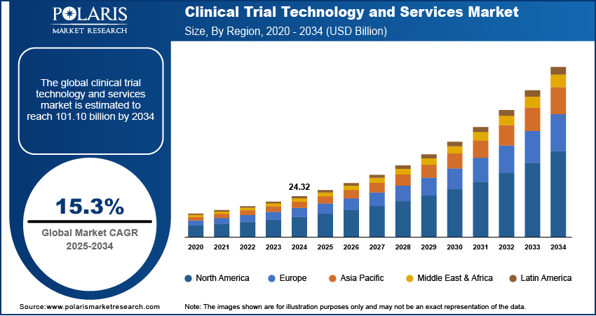 Global Clinical Trial Technology and Services Market size and share is currently valued at USD 24.32 billion in 2024 and is anticipated to generate an estimated revenue of USD 101.10 billion by 2034, according to the latest study by Polaris Market Research. Besides, the report notes that the market exhibits a robust 15.3% Compound Annual Growth Rate (CAGR) over the forecasted timeframe, 2025 – 2034