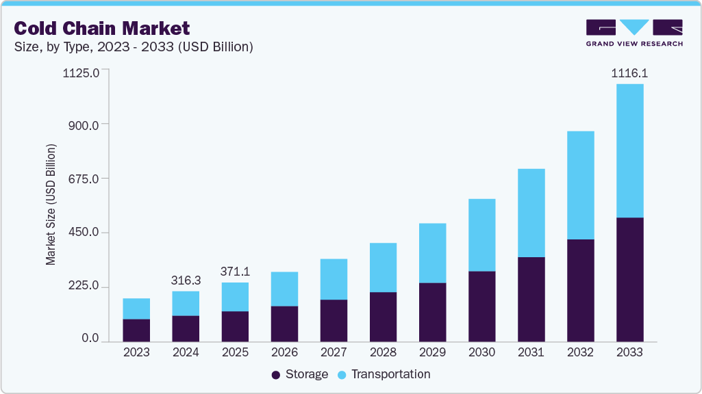 The global cold chain market size was estimated at USD 316.34 billion in 2024 and is projected to reach USD 1,611.0 billion by 2033, growing at a CAGR of 20.1% from 2025 to 2033. Changes in consumer preferences and growing e-commerce sales are expected to drive the market growth.