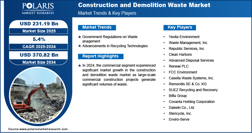 Construction and Demolition Waste Market forecasted to reach USD 370.82 billion by 2034, registering a CAGR of 5.4%