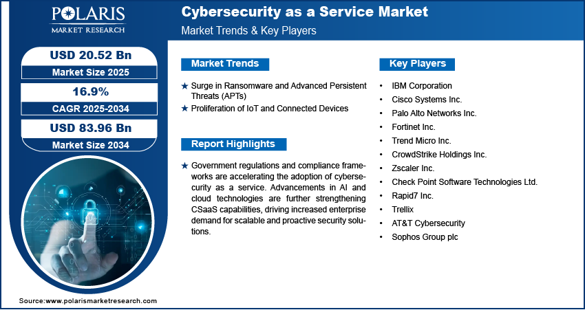 Global Cybersecurity as a Service Market size and share is currently valued at USD 8.6 billion in 2024 and is anticipated to generate an estimated revenue of USD 83.96 Billion by 2034, according to the latest study by Polaris Market Research. Besides, the report notes that the market exhibits a robust 16.9% Compound Annual Growth Rate (CAGR) over the forecasted timeframe, 2025 – 2034