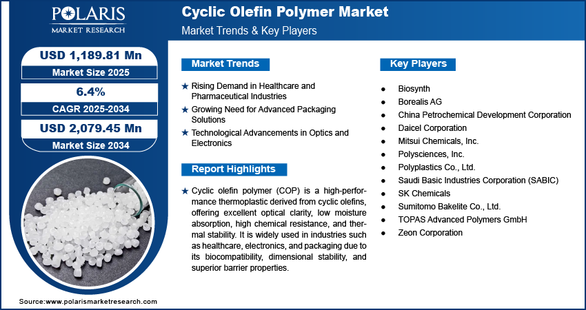 Global Cyclic Olefin Polymer Market size and share is currently valued at USD 1,120.87 million in 2024 and is anticipated to generate an estimated revenue of USD 2,079.45 million by 2034, according to the latest study by Polaris Market Research. Besides, the report notes that the market exhibits a robust 6.4% Compound Annual Growth Rate (CAGR) over the forecasted timeframe, 2025 – 2034