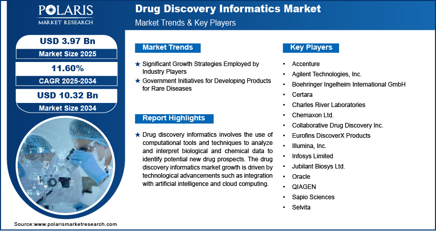 Drug Discovery Informatics Market is expected to be valued at USD 10.32 billion by 2034, growing at a CAGR of 11.60%