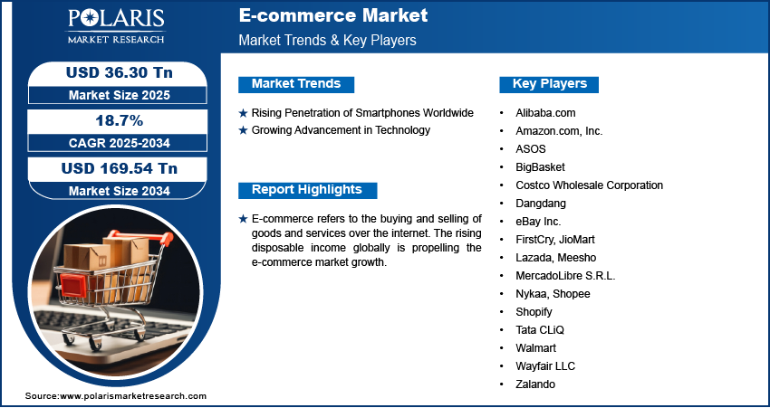 Global E-Commerce Market  size and share is currently valued at USD 30.64 trillion by 2024 and is anticipated to generate an estimated revenue of USD 169.54 trillion by 2034, according to the latest study by Polaris Market Research. Besides, the report notes that the market exhibits a robust 18.7% Compound Annual Growth Rate (CAGR) over the forecasted timeframe, 2025 – 2034