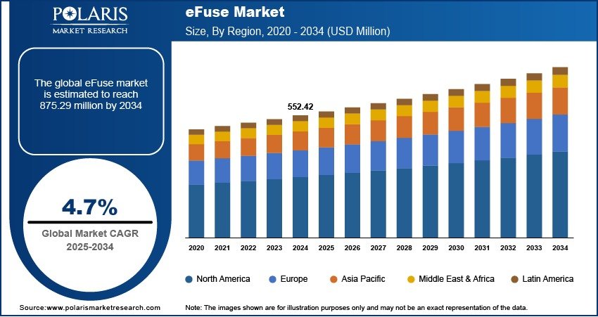 Global eFuse Market size and share is currently valued at USD 552.42 million in 2024 and is anticipated to generate an estimated revenue of USD 875.29 Million by 2034, according to the latest study by Polaris Market Research. Besides, the report notes that the market exhibits a robust 4.7% Compound Annual Growth Rate (CAGR) over the forecasted timeframe, 2025 – 2034
