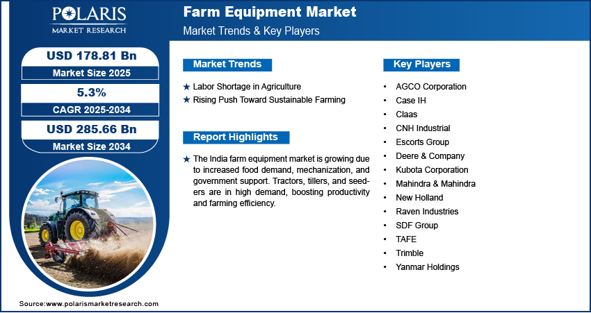 The global farm equipment market size was valued at USD 169.94 billion in 2024. The farm equipment industry is projected to grow from USD 178.81 billion in 2025 to USD 285.66 billion by 2034, exhibiting a CAGR of 5.3% during 2025–2034.