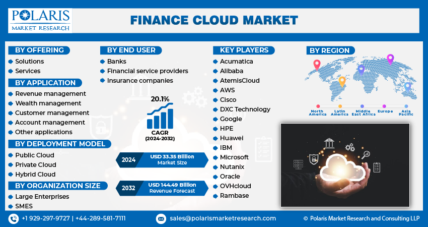 Global Finance Cloud Market size and share is currently valued at USD 27.79 billion in 2023 and is anticipated to generate an estimated revenue of USD 144.49 billion by 2032, according to the latest study by Polaris Market Research. Besides, the report notes that the market exhibits a robust 20.1% Compound Annual Growth Rate (CAGR) over the forecasted timeframe, 2024 – 2032