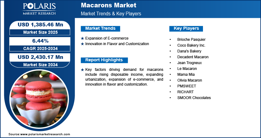 Global Macarons Market size and share is currently valued at USD 1,313.00 Million in 2024 and is anticipated to generate an estimated revenue of USD 2,430.17 Million by 2034, according to the latest study by Polaris Market Research. Besides, the report notes that the market exhibits a robust 6.44% Compound Annual Growth Rate (CAGR) over the forecasted timeframe, 2025 – 2034