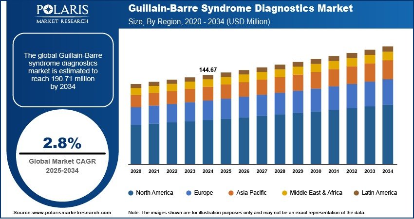Global Guillain-Barre Syndrome Diagnostics Market size and share is currently valued at USD 144.67 million in 2024 and is anticipated to generate an estimated revenue of USD 190.71 million by 2034, according to the latest study by Polaris Market Research. Besides, the report notes that the market exhibits a robust 2.8% Compound Annual Growth Rate (CAGR) over the forecasted timeframe, 2025 – 2034