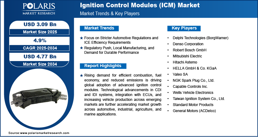 Global Ignition Control Module (ICM) Market size and share is currently valued at USD 2.95 billion in 2024 and is anticipated to generate an estimated revenue of USD 4.77 Billion by 2034, according to the latest study by Polaris Market Research. Besides, the report notes that the market exhibits a robust 4.9% Compound Annual Growth Rate (CAGR) over the forecasted timeframe, 2025 – 2034