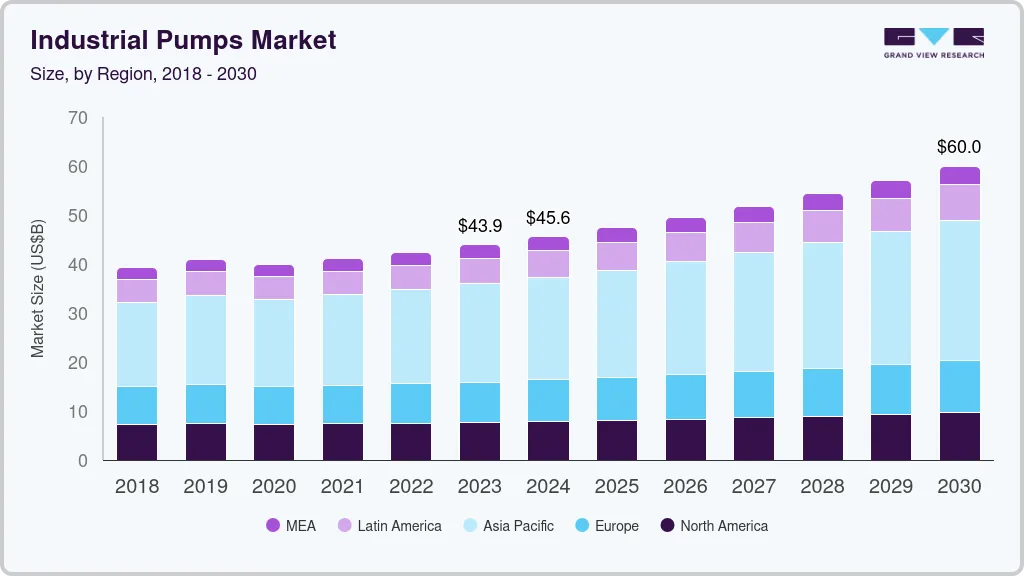The global industrial pumps market size was estimated at USD 43.90 billion in 2023 and is projected to reach USD 59.95 billion by 2030, growing at a CAGR of 4.5% from 2024 to 2030. Rising adoption of industrial pumps in various industries, including water & wastewater, chemicals, oil & gas, and power generation, is expected to drive the market growth.