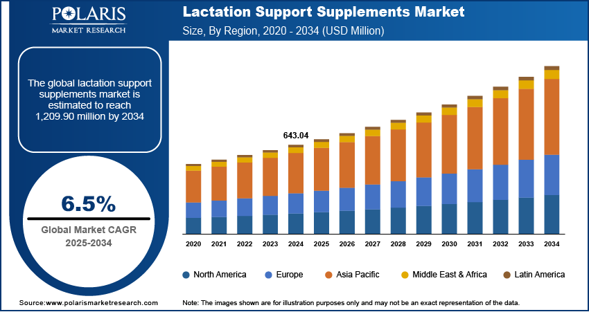 The global Lactation Support Supplements Market was valued at USD 643.04 million in 2024, and it is projected to grow to USD 1,209.90 million by 2034. During the forecast period from 2025–2034, the market is estimated to rise at a compound annual growth rate (CAGR) of 6.5%. The market is growing as awareness of breastfeeding benefits increases and concerns about maternal health continue to rise.