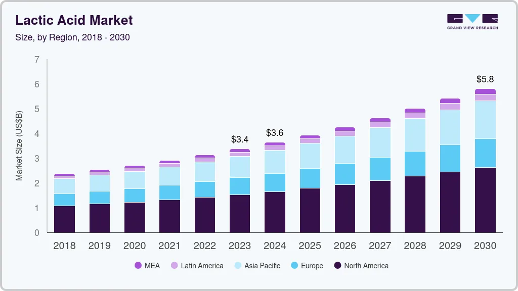 The global lactic acid market size was estimated at USD 3.36 billion in 2023 and is anticipated to reach USD 5.80 billion by 2030, growing at a CAGR of 8.0% from 2024 to 2030. The usage of this form in various end use industries including pharmaceuticals, food & beverages majorly in emerging economies such as India, China, and Indonesia are anticipated to drive demand for this form over forecast period.