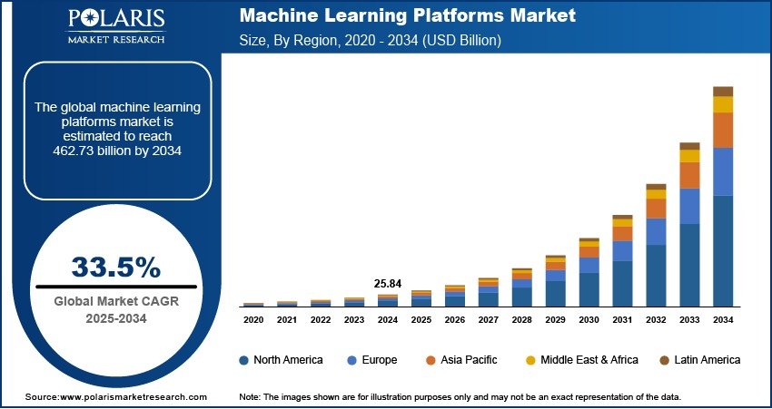 Global Machine Learning Platforms Market size and share is currently valued at USD 25.84 billion in 2024 and is anticipated to generate an estimated revenue of USD 462.73 billion by 2034, according to the latest study by Polaris Market Research. Besides, the report notes that the market exhibits a robust 33.5% Compound Annual Growth Rate (CAGR) over the forecasted timeframe, 2025 – 2034