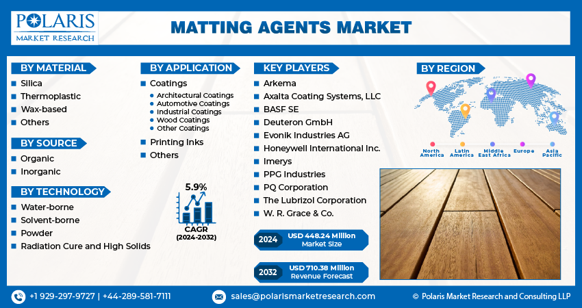 Global Matting Agents Market size and share is currently valued at USD 424.79 million in 2023 and is anticipated to generate an estimated revenue of USD 710.38 million by 2032, according to the latest study by Polaris Market Research. Besides, the report notes that the market exhibits a robust 5.9% Compound Annual Growth Rate (CAGR) over the forecasted timeframe, 2024 – 2032