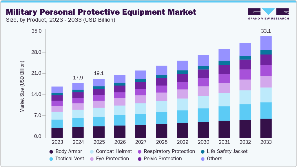The global military personal protective equipment market size was estimated at USD 17.85 billion in 2024 and is projected to reach USD 33.13 billion by 2033, growing at a CAGR of 7.1% from 2025 to 2033. The increasing geopolitical tensions and rising defense budgets across nations are key drivers fueling demand for advanced military personal protective equipment (PPE).