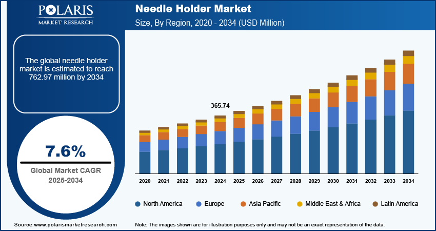 Global Needle Holder Market size and share is currently valued at USD 365.74 million in 2024 and is anticipated to generate an estimated revenue of USD 762.97 million by 2034, according to the latest study by Polaris Market Research. Besides, the report notes that the market exhibits a robust 7.6% Compound Annual Growth Rate (CAGR) over the forecasted timeframe, 2025 – 2034