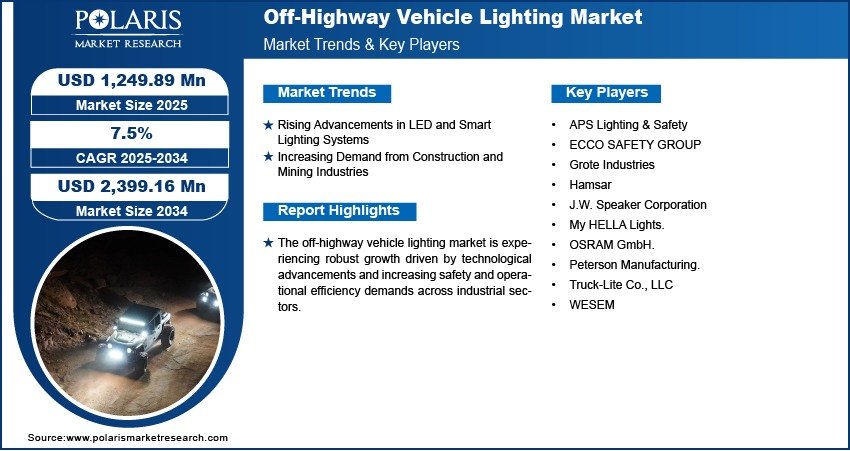 Global Off-Highway Vehicle Lighting Market size and share is currently valued at USD 1,164.42 million in 2024 and is anticipated to generate an estimated revenue of USD 2,399.16 million by 2034, according to the latest study by Polaris Market Research. Besides, the report notes that the market exhibits a robust 7.5% Compound Annual Growth Rate (CAGR) over the forecasted timeframe, 2025 – 2034