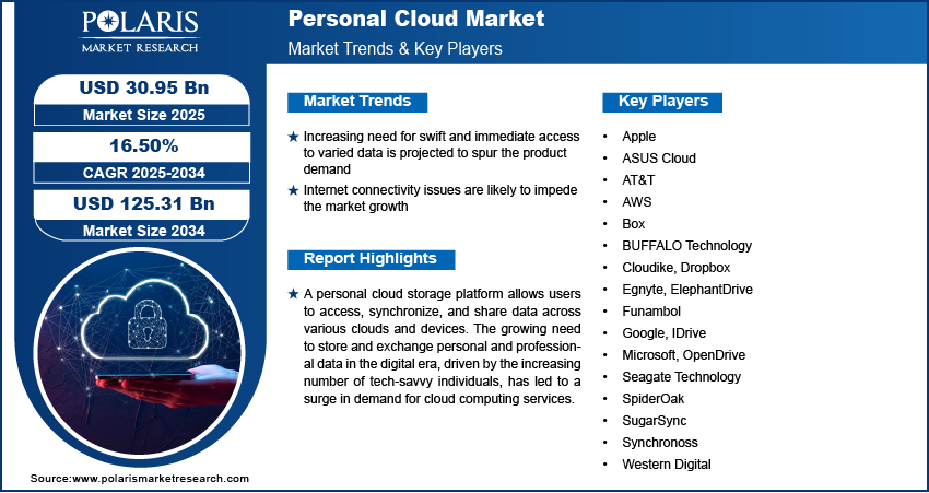 Personal Cloud Market is anticipated to hit USD 125.31 Billion by 2034, registering a CAGR of 16.50%.
