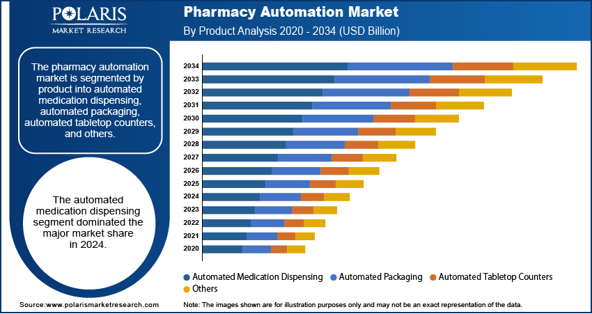- The pharmacy automation market is segmented by product into automated medication dispensing, automated packaging, automated tabletop counters, and others. Among these, the automated medication dispensing segment dominated the major market share in 2024. This is primarily driven by the increasing demand for accurate, efficient, and safe medication management systems in both hospitals and retail pharmacies.