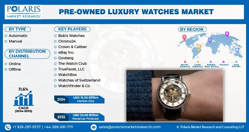 Global Pre-owned Luxury Watches Market size and share is currently valued at USD 11.94 billion in 2023 and is anticipated to generate an estimated revenue of USD 32.05 billion by 2032, according to the latest study by Polaris Market Research. Besides, the report notes that the market exhibits a robust 11.6% Compound Annual Growth Rate (CAGR) over the forecasted timeframe, 2024 – 2032