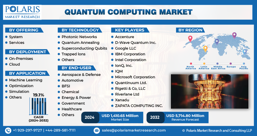 Global Quantum Computing Market size and share is currently valued at USD 1,187.92 million in 2023 and is anticipated to generate an estimated revenue of USD 5,714.80 million by 2032, according to the latest study by Polaris Market Research. Besides, the report notes that the market exhibits a robust 19.1% Compound Annual Growth Rate (CAGR) over the forecasted timeframe, 2024 – 2032