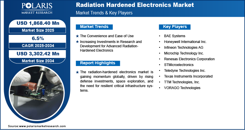 Global Radiation Hardened Electronics Market size and share is currently valued at USD 1,812.57 million in 2024 and is anticipated to generate an estimated revenue of USD 3,302.42 million by 2034, according to the latest study by Polaris Market Research. Besides, the report notes that the market exhibits a robust 6.5% Compound Annual Growth Rate (CAGR) over the forecasted timeframe, 2025 – 2034