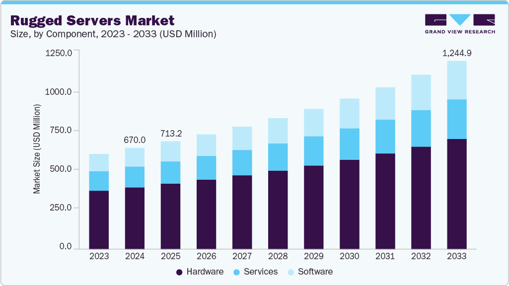 The global rugged servers market size was estimated at USD 670.0 million in 2024 and is projected to reach USD 1,244.9 million by 2033, growing at a CAGR of 7.2% from 2025 to 2033. This growth can be attributed to the increasing demand for high-performance computing in challenging and mission-critical environments, including defense, aerospace, industrial automation, telecommunications, transportation, and energy.
