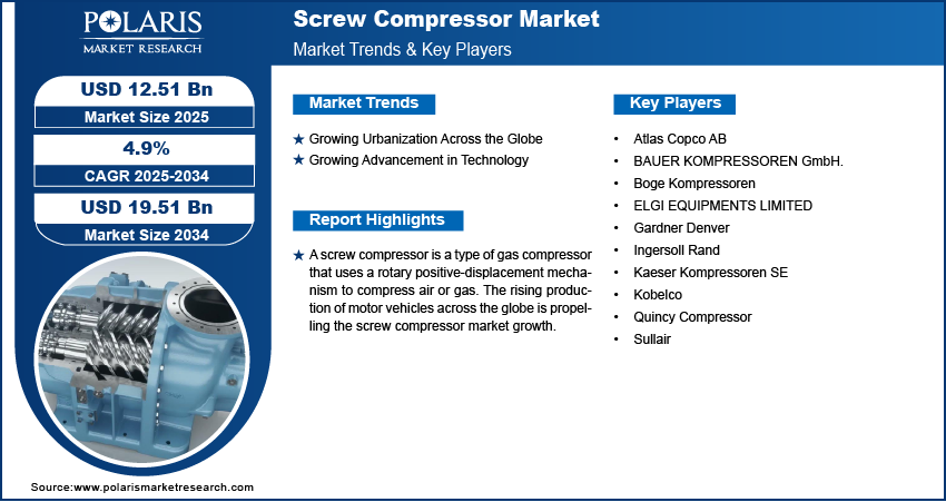 Screw Compressor Market is forecast to reach USD 19.51 billion by 2034, expanding at 4.9%