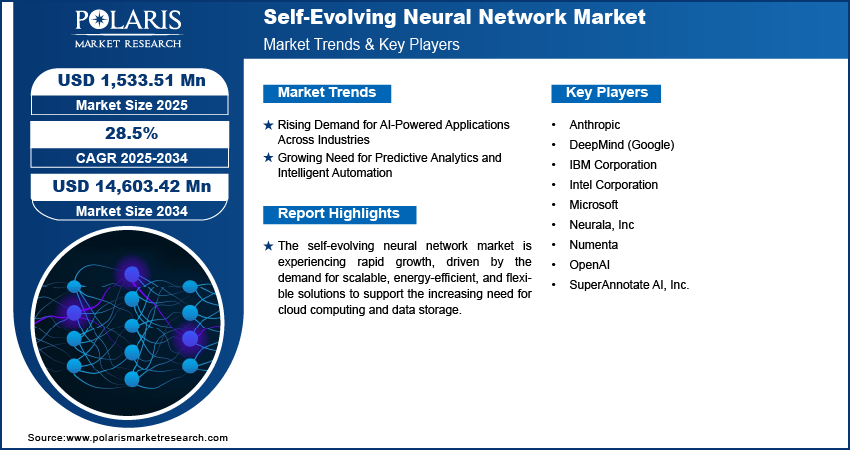 Global Self-Evolving Neural Network Market size and share is currently valued at USD 1,201.24 million in 2024 and is anticipated to generate an estimated revenue of USD 14,603.42 million by 2034, according to the latest study by Polaris Market Research. Besides, the report notes that the market exhibits a robust 28.5% Compound Annual Growth Rate (CAGR) over the forecasted timeframe, 2025 – 2034