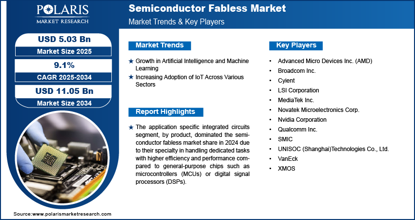 Global Semiconductor Fabless Market size and share is currently valued at USD 4.61 billion in 2024 and is anticipated to generate an estimated revenue of USD 11.05 billion by 2034, according to the latest study by Polaris Market Research. Besides, the report notes that the market exhibits a robust 9.1% Compound Annual Growth Rate (CAGR) over the forecasted timeframe, 2025 – 2034