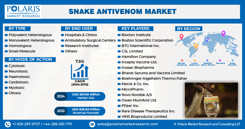 Global Snake Antivenom Market size and share is currently valued at USD 332.73 million in 2023 and is anticipated to generate an estimated revenue of USD 636.85 Million by 2032, according to the latest study by Polaris Market Research. Besides, the report notes that the market exhibits a robust 7.5% Compound Annual Growth Rate (CAGR) over the forecasted timeframe, 2024 – 2032