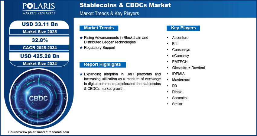 Global Stablecoins & CBDCs Market size and share is currently valued at USD 25.20 billion in 2024 and is anticipated to generate an estimated revenue of USD 425.28 billion by 2034, according to the latest study by Polaris Market Research. Besides, the report notes that the market exhibits a robust 32.8% Compound Annual Growth Rate (CAGR) over the forecasted timeframe, 2025 – 2034