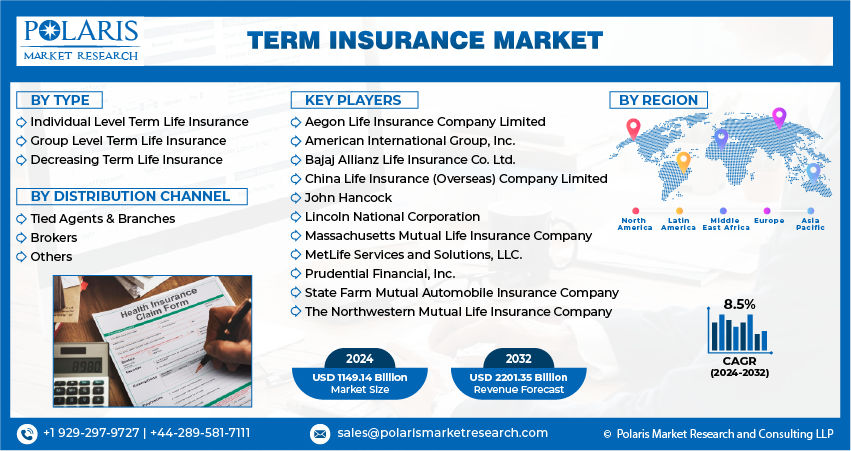 Global Term Insurance Market size and share is currently valued at USD 1060.77 billion in 2023 and is anticipated to generate an estimated revenue of USD 2,201.35 billion by 2032, according to the latest study by Polaris Market Research. Besides, the report notes that the market exhibits a robust 8.5% Compound Annual Growth Rate (CAGR) over the forecasted timeframe, 2024 – 2032