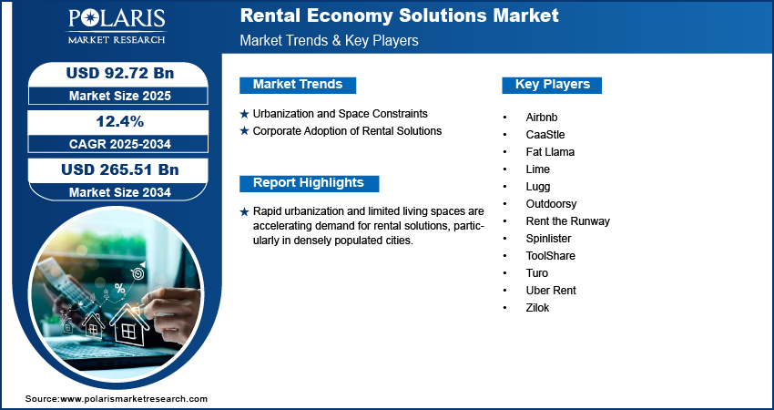 The Rental Economy Solutions market is forecast to grow to USD 265.51 billion by 2034, at a CAGR of 12.4%