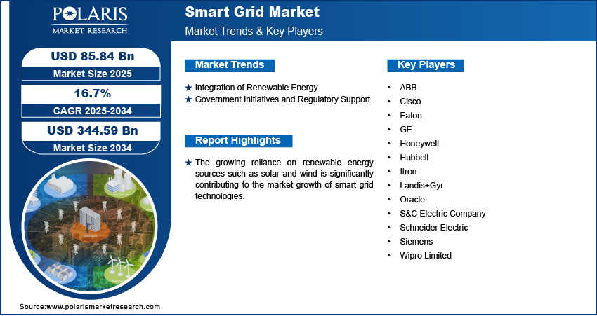 The global Smart Grid market was valued at USD 73.77 billion in 2024, and it is projected to grow to USD 344.59 billion by 2034. During the forecast period from 2025-2034, the market is estimated to rise at a compound annual growth rate (CAGR) of 16.7%.