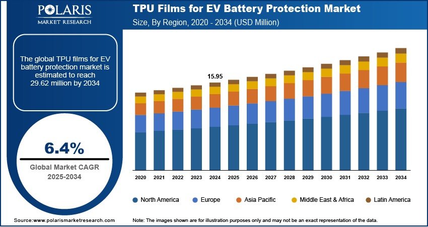 Global TPU films for EV battery protection market size and share is currently valued at USD 15.95 million in 2024 and is anticipated to generate an estimated revenue of USD 29.62 million, according to the latest study by Polaris Market Research. Besides, the report notes that the market exhibits a robust 6.4% Compound Annual Growth Rate (CAGR) over the forecasted timeframe, 2025 – 2034