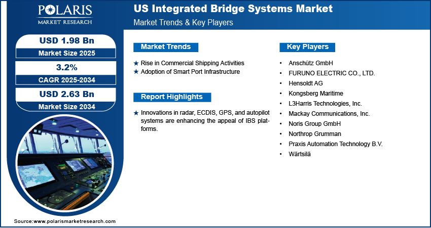 Global US Integrated Bridge Systems Market size and share is currently valued at USD 1.92 billion in 2024 and is anticipated to generate an estimated revenue of USD 2.63 billion by 2034, according to the latest study by Polaris Market Research. Besides, the report notes that the market exhibits a robust 3.2% Compound Annual Growth Rate (CAGR) over the forecasted timeframe, 2025 – 2034