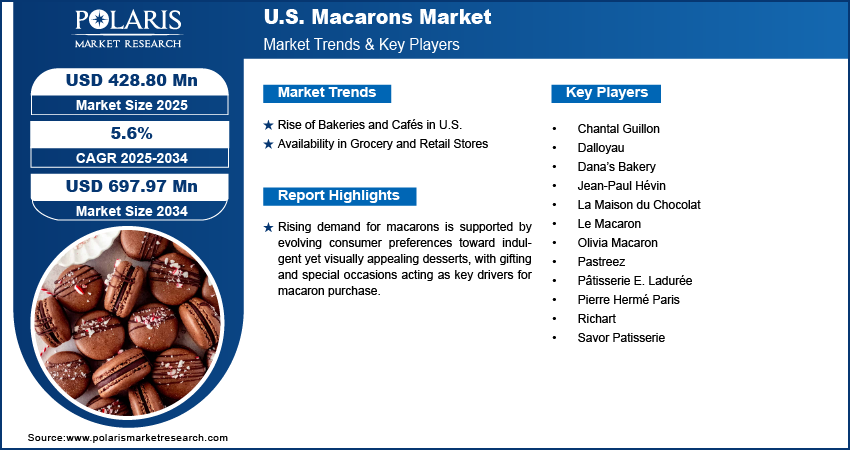 U.S. Macarons Market size and share is currently valued at USD 406.72 Million in 2024 and is anticipated to generate an estimated revenue of USD 697.97 Million by 2034, according to the latest study by Polaris Market Research. Besides, the report notes that the market exhibits a robust 5.6% Compound Annual Growth Rate (CAGR) over the forecasted timeframe, 2025 – 2034
