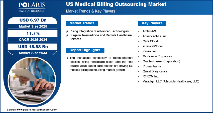The US medical billing outsourcing market size was valued at USD 6.26 billion in 2024. The market is expected to grow from USD 6.97 billion in 2025 to USD 18.88 billion by 2034, exhibiting a CAGR of 11.7% during 2025–2034.
