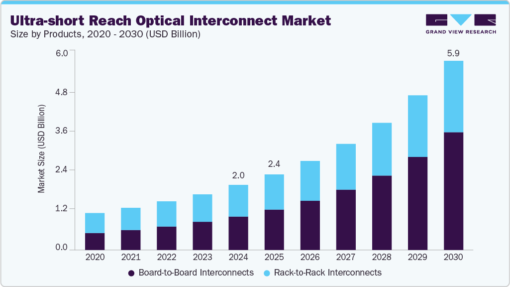 The global ultra-short reach optical interconnect market size was estimated at USD 2.03 billion in 2024 and is projected to reach USD 5.95 billion by 2030, growing at a CAGR of 20.2% from 2025 to 2030. This growth is driven by rising demand for high-speed, low-latency data transfer in AI, cloud computing, and chip-to-chip communication, as organizations scale infrastructure to handle advanced workloads, cut energy use, and ease bandwidth bottlenecks in dense data centers.