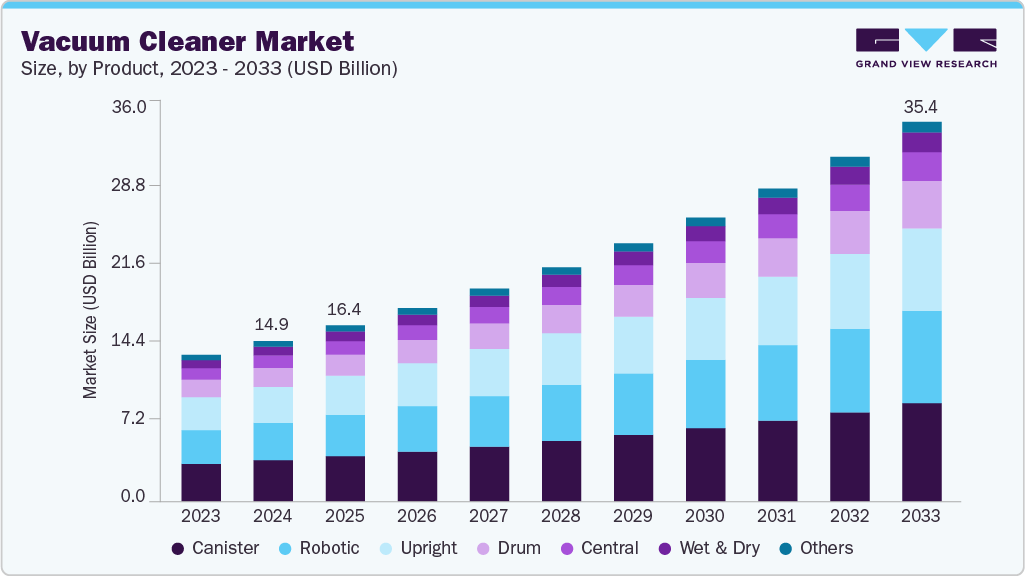 The global vacuum cleaner market size was valued at USD 14.93 billion in 2024 and is expected to reach USD 35.37 billion by 2033, growing at a CAGR of 10.1% from 2025 to 2033. The factors, including changing lifestyles, high disposable incomes, and a growing working population, have driven market growth. In addition, increased awareness about the benefits of maintaining cleanliness in residential and commercial places has contributed to the market’s growth.
