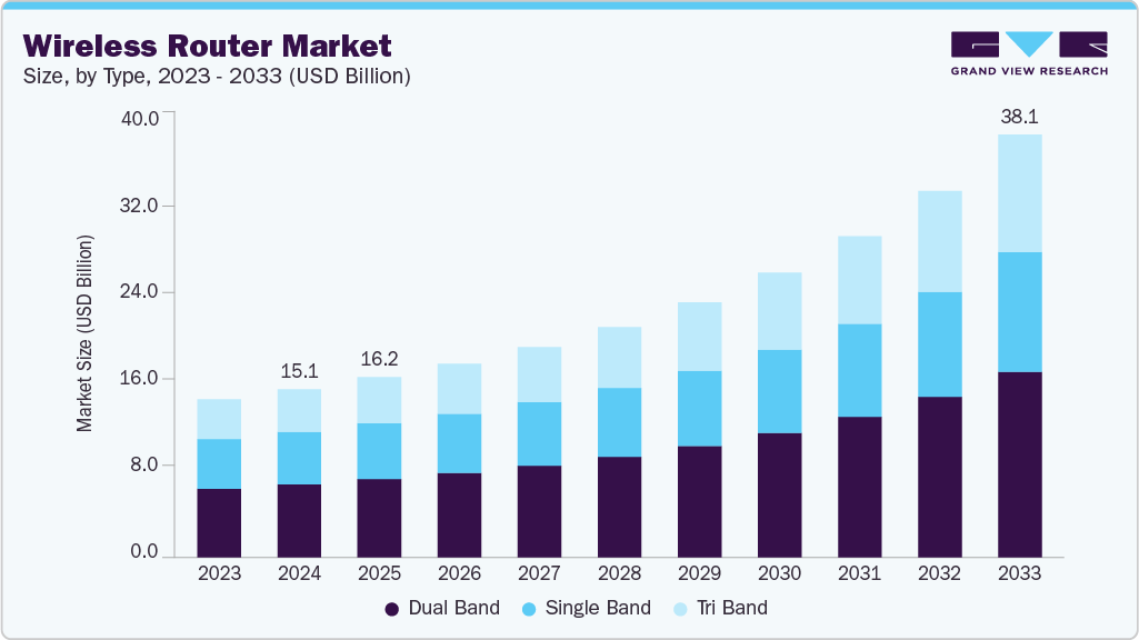 The global wireless router market size was estimated at USD 15.15 billion in 2024 and is projected to reach USD 38.10 billion in 2033, growing at a CAGR of 11.3% from 2025 to 2033. The market is experiencing significant growth, driven primarily by the rising demand for high-speed internet connectivity.